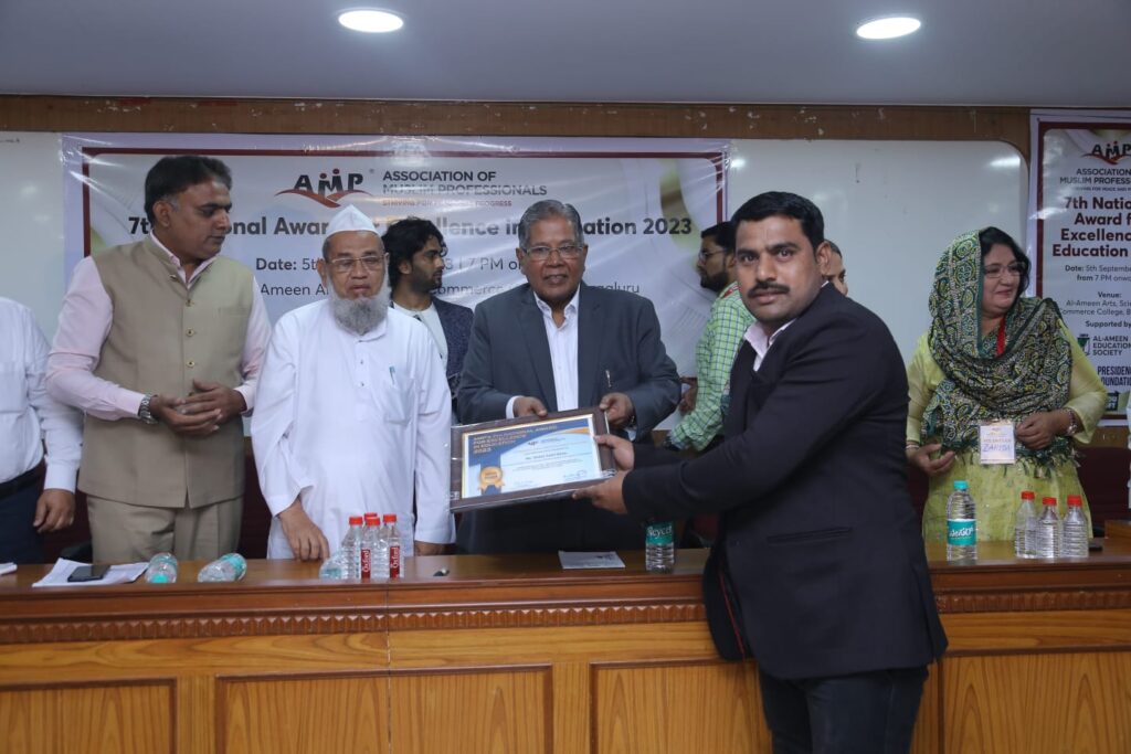 *पूर्व केंद्रीय अल्पसंख्यक मामलों के मंत्री और राज्यसभा के पूर्व उप सभापति श्री के. रहमान खान और एएमपी अध्यक्ष अमीर एड्रेसी ने 5 सितंबर 2023 को बेंगलुरु (कर्नाटक) के अल अमीन आर्ट्स एंड साइंस कॉलेज में आयोजित समारोह में पुरस्कार प्रदान किया।*