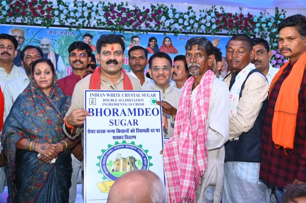 उपमुख्यमंत्री विजय शर्मा ने छत्तीसगढ़ के प्रथम भोरमदेव सहकारी शक्कर कारखाना के शेयर धारकों को रियायती दर पर शक्कर वितरण का शुभारंभ किया