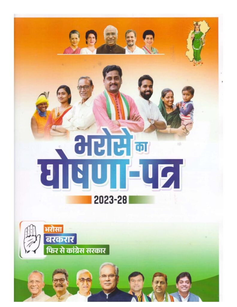 घोषणा पत्र में 3200 रुपए में प्रति क्विंटल धान खरीदने, किसानों का कर्जमाफ करने, केजी टू पीजी तक मुफ्त शिक्षा की घोषणा की गई है. इसके अलावा कांग्रेस ने साढ़े 17.5 लाख गरीब परिवार को आवास देने की भी बड़ी घोषणा की है. कांग्रेस की घोषणा पत्र के बड़े वादों में किसानों का कर्ज माफी, ₹3200 प्रति क्विंटल में धान खरीदी, 20 क्विंटल प्रति एकड़ धान खरीदी, 200 यूनिट बिजली फ्री, सभी सरकारी स्कूल कॉलेज में केजी लेकर पीजी तक मुक्त शिक्षा, तेंदूपत्ता का प्रति बोरा ₹600 और ₹400 सालाना बोनस,