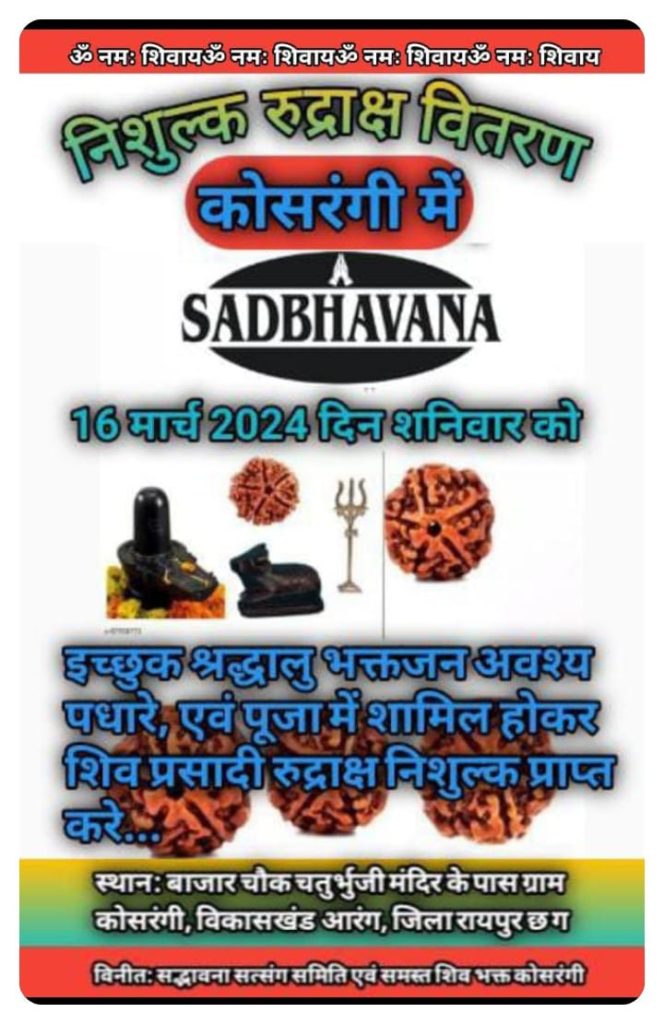 आरंग।अत्यंत हर्ष का विषय है कि ग्राम कोसरंगी के बाजार चौक में चतुर्भुजी मंदिर के पास दिनांक 16 मार्च 2024 दिन शनिवार को निःशुल्क शिव प्रसादी रुद्राक्ष वितरण का कार्यक्रम कर रहे हैं, सभी श्रद्धालु भक्तजन जो रुद्राक्ष प्राप्त करना चाहते हैं वे विविध पूजा सामग्री जैसे फूल, बेलपत्र, दूध, दही, घी, शक्कर, शहद, गंगाजल, धतूरा आदि अपने स्वेच्छा अनुसार लाकर भोलेनाथ का पुजा अर्चना अभिषेक स्वयं करेंगे, जहां पर ओम नमः शिवाय श्री शिवाय नमस्तुभ्यं महा मृत्युंजय मंत्र का जाप तथा आरती के पश्चात फ्री में पूजा में उपस्थित समस्त लोगों को निशुल्क शिव प्रसादी रुद्राक्ष वितरण किया जाएगा, अतः सभी श्रद्धालु भक्तजन अवश्य पधारे, इस हेतु आवश्यक व्यवस्था सद्भावना सत्संग समिति एवं कोसरंगी के सभी शिवभक्त जन सहयोग से करेंगे…..