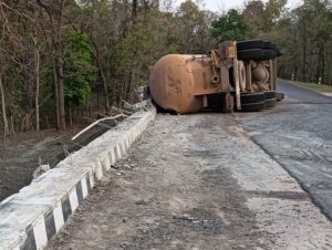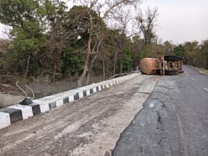 गरियाबंद। गरियाबंद जिला मुख्यालय से 20 कि.मी दूर नवागढ़ के पास आज एक शराबी टेंकर चालक ने अनियंत्रित टेंकर चलाते हुये मुड़धूनी नाला के पुल की रेलिंग तोड़ते हुये पुल पर टेंकर पलटा कर भाग निकला टेंकर किसी निर्माण कार्य में सँलग्न था सीमेंट भरा था।