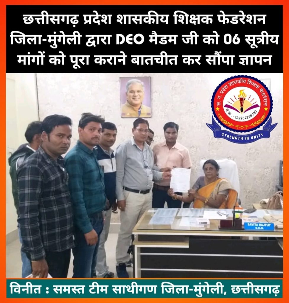 मुंगेली//- छत्तीसगढ़ प्रदेश शासकीय शिक्षक फेडरेशन जिला मुंगेली के जिला अध्यक्ष- राजकुमार घृतलहरे के नेतृत्व में जिला शिक्षा अधिकारी मुंगेली श्रीमती सविता राजपूत को शिक्षकों की 06 सूत्री मांगों का ज्ञापन सौंपा गया मांग में प्रमुख रूप से सहायक शिक्षक से प्राथमिक शाला प्रधान पाठक के पद पर पदोन्नति पश्चात रिक्त हुए पदों को अविलंब प्रतीक्षा सूची से पूर्ति करने , प्रधान पाठक के पद पर पदोन्नति पश्चात कार्यभार ग्रहण करने वाले शिक्षकों की सूची सार्वजनिक करने , वर्ष 2018 में संविलियन हुए पंचायत शिक्षक संवर्ग के शिक्षकों को समयमान वेतनमान, निम्न से उच्च पद की शेष एरियर्स राशि का अविलंब भुगतान करने , विषय विकल्प के पद पर मिडिल स्कूलों में कार्यरत शिक्षकों के पद को रिक्त मानते हुए सहायक शिक्षक एलबी से उच्च वर्ग शिक्षक के पद पर पदोन्नति हेतु विषयवार रिक्त पद का प्रस्ताव संभागीय कार्यालय संयुक्त संचालक बिलासपुर को भेजने 01.07. 2019 व 01.01.2020 को संविलियन हुए सहायक शिक्षक एलबी को पदोन्नति प्रक्रिया में शामिल कर पदोन्नति हेतु सूची में नाम जोड़कर प्रस्ताव संभागीय कार्यालय संयुक्त संचालक बिलासपुर को भेजने , स्थानांतरण से अंतर जिला /विकासखंड से आए हुए शिक्षक /शिक्षिकाओं को प्रथम नियुक्ति तिथि से वरिष्ठता प्रदान करते हुए पदोन्नति की प्रक्रिया में शामिल करने के लिएबातचीत कर ज्ञापन सौंपा गया।