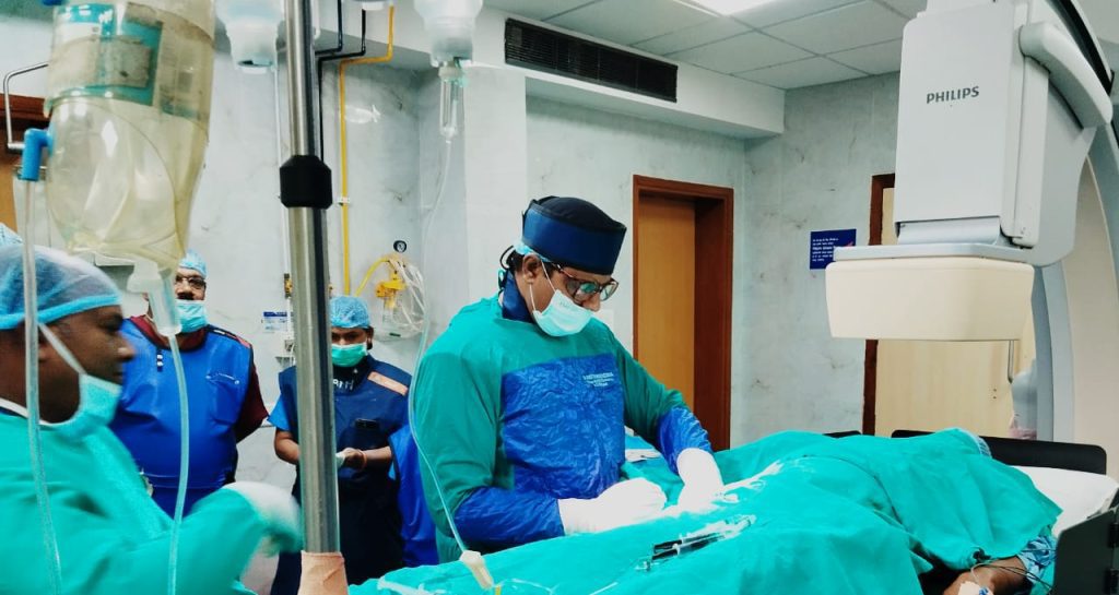 कैथलैब में फ्लूरोस्कोपी की सहायता से लेफ्ट सबक्लेवियन वेन को पंक्चर करके राइट वेंट्रिकल एपेक्स में पेसमेकर लीड डाला गया। बच्चा छोटा था इसलिए सुई को बड़े ध्यान से डाला गया। सुई और तार की साइज बड़ी रहती है इसलिए हार्ट को नुकसान होने की संभावना रहती है। पेसमेकर के तार को एक्स्ट्रा लूप डालकर छोड़ा जाता है क्योंकि बच्चे की उम्र जैसे-जैसे बढ़ेगी हार्ट की साइज भी बढ़ेगी। बच्चे की ऊंचाई भी बढ़ेगी इसलिए तार में खिंचाव आएगा। इसी को ध्यान में रखते हुए तार में एक्स्ट्रा लूप डालकर छोड़ा गया।