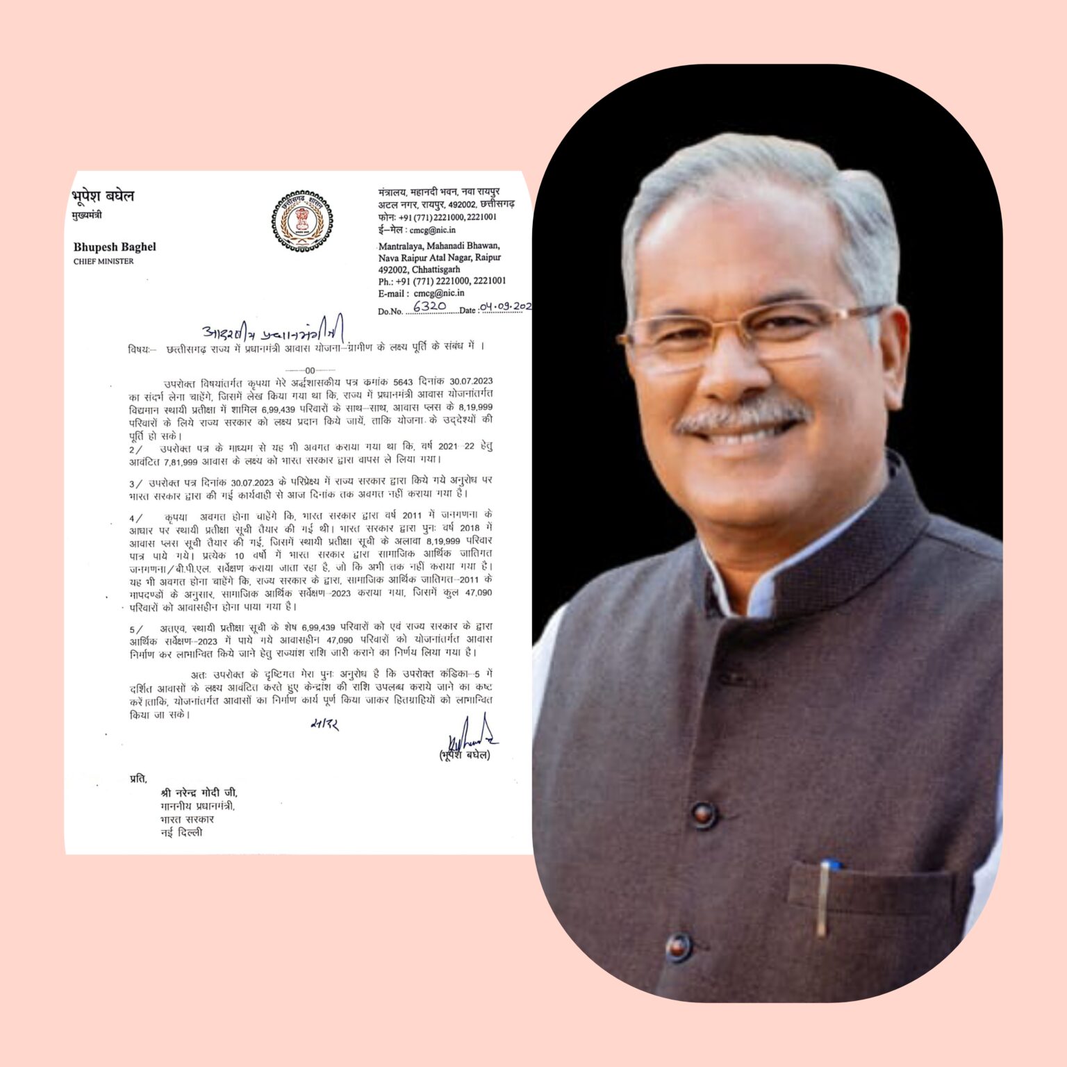 मुख्यमंत्री श्री भूपेश बघेल ने प्रधानमंत्री श्री नरेंद्र मोदी को लिखा पत्र