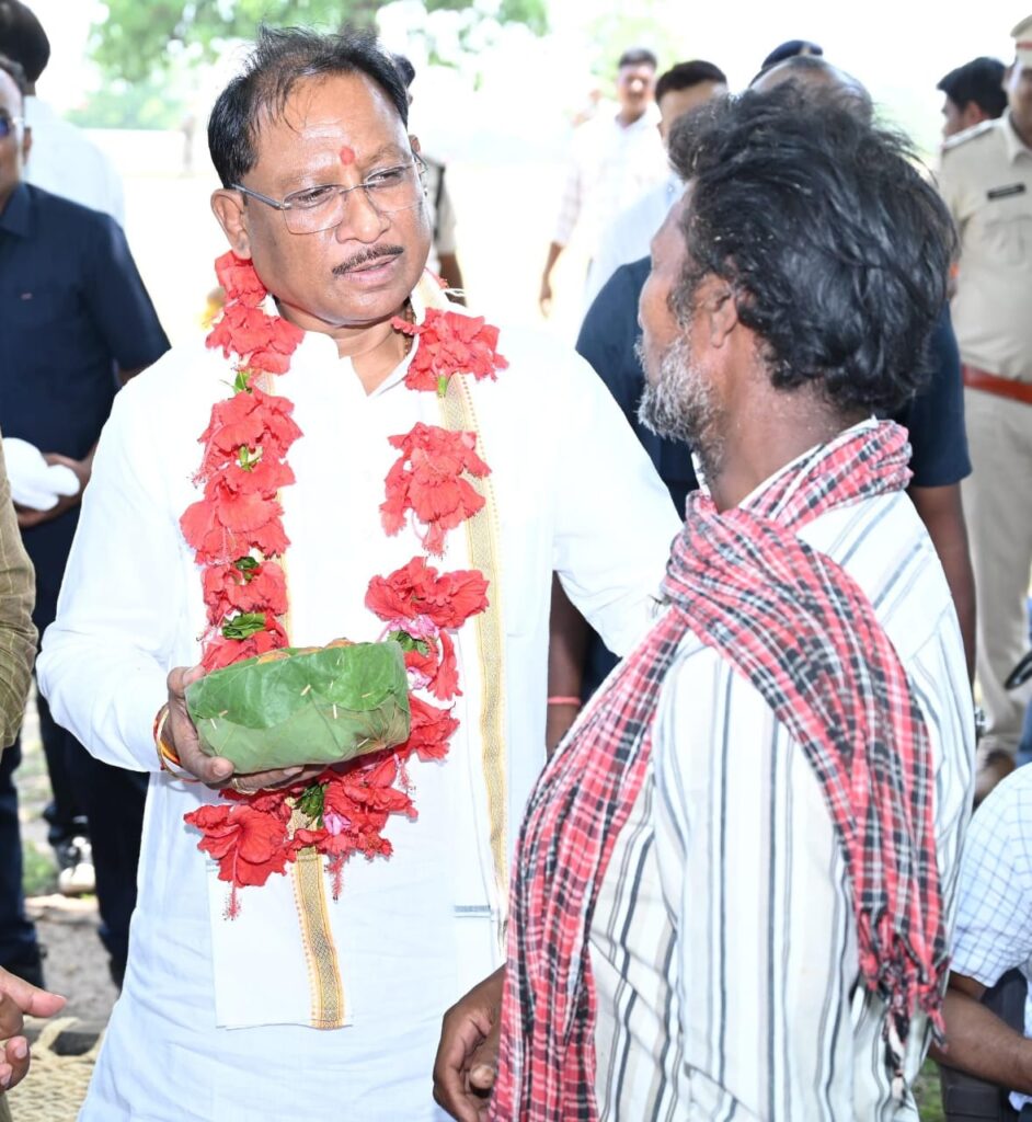 रायपुर 19 मई 2025/सुशासन तिहार के अंतर्गत मुख्यमंत्री श्री विष्णु देव साय आज बिना पूर्व सूचना के हेलीकॉप्टर से गौरेला-पेंड्रा-मरवाही जिले के बैगा बाहुल्य ग्राम चुकतीपानी पहुंचे। ग्रामीण अपने बीच मुख्यमंत्री श्री साय को यूं अचानक पाकर आश्चर्यचकित हो गए, लेकिन कुछ ही क्षणों में यह हैरानी स्वागत में बदल गई। ग्रामीणों ने गुलमोहर की माला, तेंदू फल की टोकरी और स्थानीय फूल-पत्तियों से बना गुलदस्ता भेंट कर मुख्यमंत्री श्री साय का आत्मीय अभिनंदन किया।