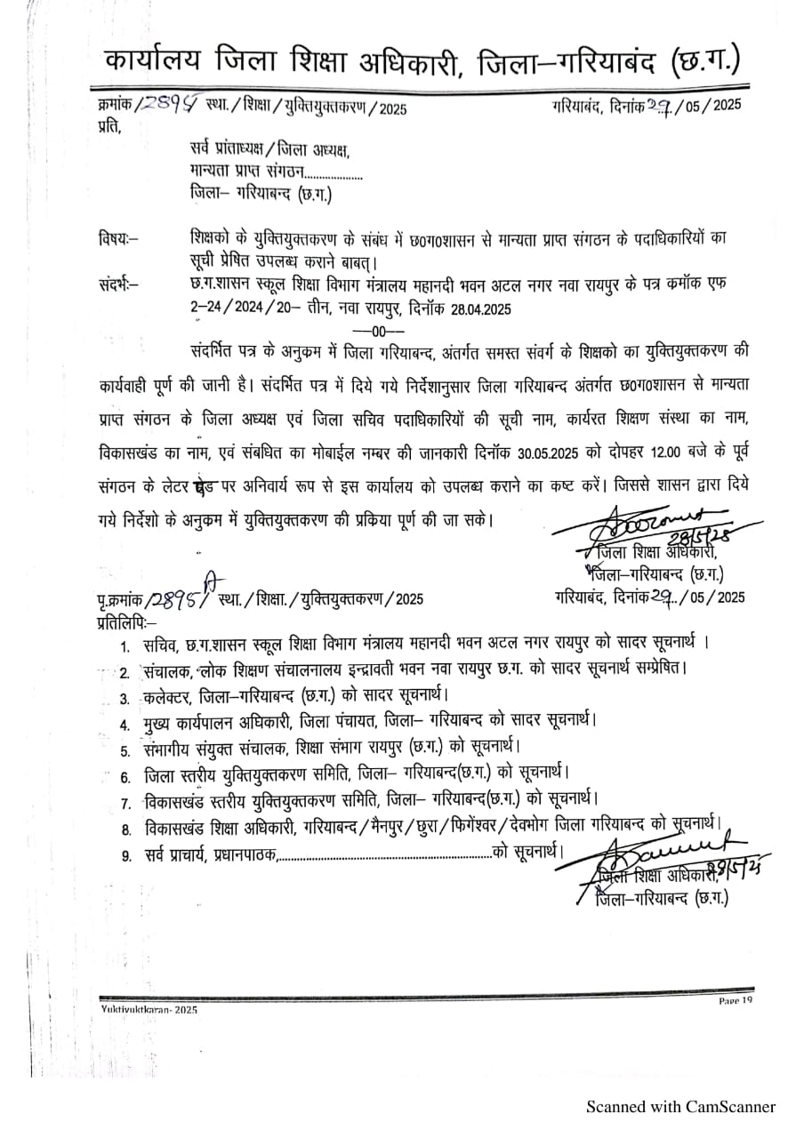 गरियाबंद। अतिशेष शिक्षकों का युक्तियुक्त करण के तहत होने वाले पदस्थापना काउंसिलिंग मे मान्यता प्राप्त शिक्षक संगठन के पदाधिकारीयों को ब्लॉक व जिला मुख्यालय के नजदीक रिक्त स्कूल मे पदस्थापना देने हेतु शासन के निर्देश के तहत जिला शिक्षा अधिकारी गरियाबंद ने 30 मई तक मांगी है देखें आदेश।