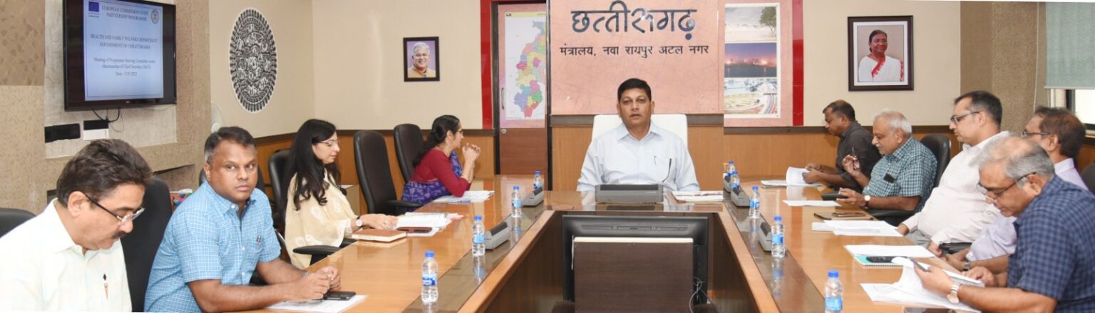 रायपुर, 15 मई 2023/ मुख्य सचिव श्री अमिताभ जैन की अध्यक्षता में आज यहां मंत्रालय महानदी भवन में यूरोपियन संघ राज्य साझेदारी कार्यक्रम संचालन समिति की बैठक सम्पन्न हुई। बैठक में इ.सी.एस.पी.पी अंतर्गत संचालित खातों में उपलब्ध राशि के बेहतर उपयोग के संबंध में विचार विमर्श किया गया। बैठक में लोक स्वास्थ्य एवं परिवार कल्याण तथा चिकित्सा शिक्षा विभाग की अपर मुख्य सचिव श्रीमती रेणु जी पिल्ले भी मौजूद थी।