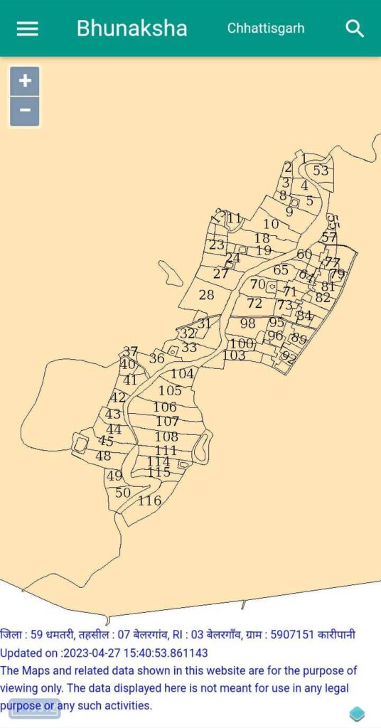 कलेक्टर धमतरी श्री ऋतुराज रघुवंशी द्वारा गठित की गई टीम के माध्यम से 30 ग्रामों का राजस्व अभिलेख तैयार किया जा रहा है। इसी प्रकार 09 ग्रामों के अभिलेख को भुंईया पोर्टल मे अपलोड करने आयुक्त कार्यालय भेजा जा चुका है। 05 ग्रामों के अभिलेख भुईया पोर्टल में अपलोड किया जा चुका है और ग्रामीणों को नक्शा, खसरा और बी-1 का वितरण कराया जा चुका है। इस सप्ताह 09 ग्रामों का अभिलेख तैयार कर शासन को प्रेषित कर दी जावेगी। खरीफ मौसम के शुरू होने के पूर्व 57 ग्रामों का अभिलेख तैयार कर अपलोड करने का लक्ष्य निर्धारित किया गया, शेष 30 ग्रामों का अभिलेख तैयार करने कार्य प्रगति पर है।