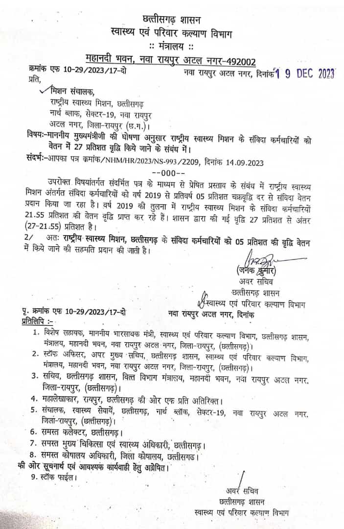 अतः राष्ट्रीय स्वास्थ्य मिशन, छत्तीसगढ़ के संविदा कर्मचारियों को 05 प्रतिशत की वृद्धि वेतन में किये जाने की सहमति प्रदान की जाती है।