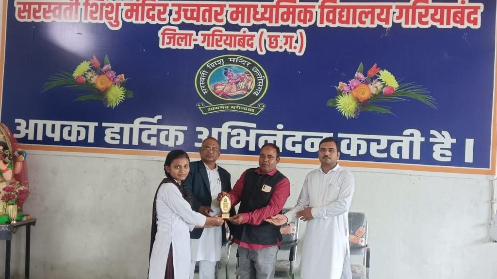 गरियाबंद। गरियाबंद स्थित सरस्वती शिशु मंदिर उच्चतर माध्यमिक विद्यालय के इस वर्ष प्रावीण्य सूची में उत्तीर्ण भैया बहिनों क़ा आज संस्था में शील्ड देकर सम्मानित कर उनके उज्जवल भविष्य की कामना की गई।