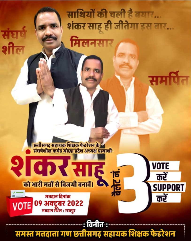 छत्तीसगढ़ सहायक शिक्षक फ़ेडरेशन प्रदेश के सबसे बड़ा कर्मचारी संगठन है, प्रदेश के सहायक शिक्षकों का एक बड़ा संगठन है, जो सहायक शिक्षकों के हित के लिए संघर्ष में सदैव अग्रणी रहा है। शंकर साहू 02 साल तक संकुल अध्यक्ष, 03 साल तक ब्लॉक अध्यक्ष और छत्तीसगढ़ सहायक शिक्षक फेडरेशन में वर्ष 2018 से अगस्त 2022 तक राजनांदगांव जिला अध्यक्ष पद पर रह चुके हैं, वे शुरू से फ़ेडरेशन के बैनर तले हुए सभी आंदोलनों में सक्रिय भागीदारी निभा चुके हैं. शंकर साहू की पढ़ाई लिखाई बस्तर संभाग में भी हुई है, लिहाजा वे बस्तर के शिक्षकों की पीड़ा से भलीभांति अवगत हैं। शिक्षक बनने के बाद शंकर साहू जहां भी पदस्थ रहे, विद्यार्थियों का भविष्य संवारने के साथ साथ प्रदेश के सहायक शिक्षिकों के हित और अधिकारों के लिए संघर्ष करने में कतई पीछे नहीं रहे। यही वजह है कि वे विद्यार्थियों व पालकों के साथ ही शिक्षकों के बीच भी सामान रूप से लोकप्रिय हैं। संकुल, ब्लॉक से लेकर जिला और प्रदेश स्तर तक शंकर साहू सहायक शिक्षकों की मुखर आवाज़ बनकर आगे रहे हैं। उन्हें छत्तीसगढ़ प्रदेश के सहायक शिक्षकों का व्यापक समर्थन मिलने की एक बड़ी वजह यह भी है। उन्होंने मां दंतेश्वरी की पावन भूमि की मिट्टी को माथे पर लगाकर तथा मां दंतेश्वरी की पूजा अर्चना कर अपना नामांकन दाखिल किया. उनके बस्तर दौरा में चुनावी प्रचार-प्रसार के दौरान शंकर साहू के साथ सहायक शिक्षक साथीगण भी मौजूद थे। नामांकन दाखिले के बाद शंकर साहू ने साथियों के साथ सघन प्रचार अभियान भी चलाया।