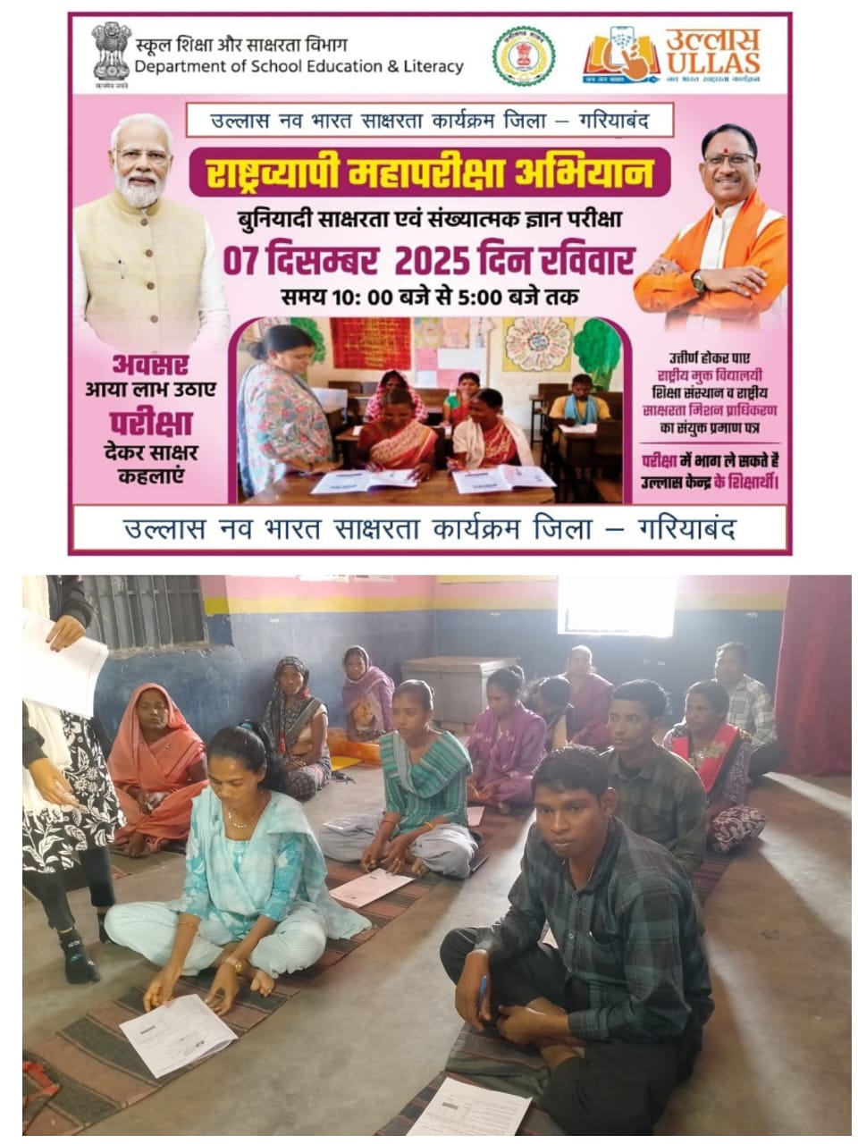 राष्ट्रव्यापी महापरीक्षा अभियान (उल्लास नव भारत साक्षरता कार्यक्रम) के तहत जिला गरियाबंद अंतर्गत आयोजित महापरीक्षा में कुल 22 आत्मसमर्पित माओवादियों ने परीक्षा में भाग लिया।