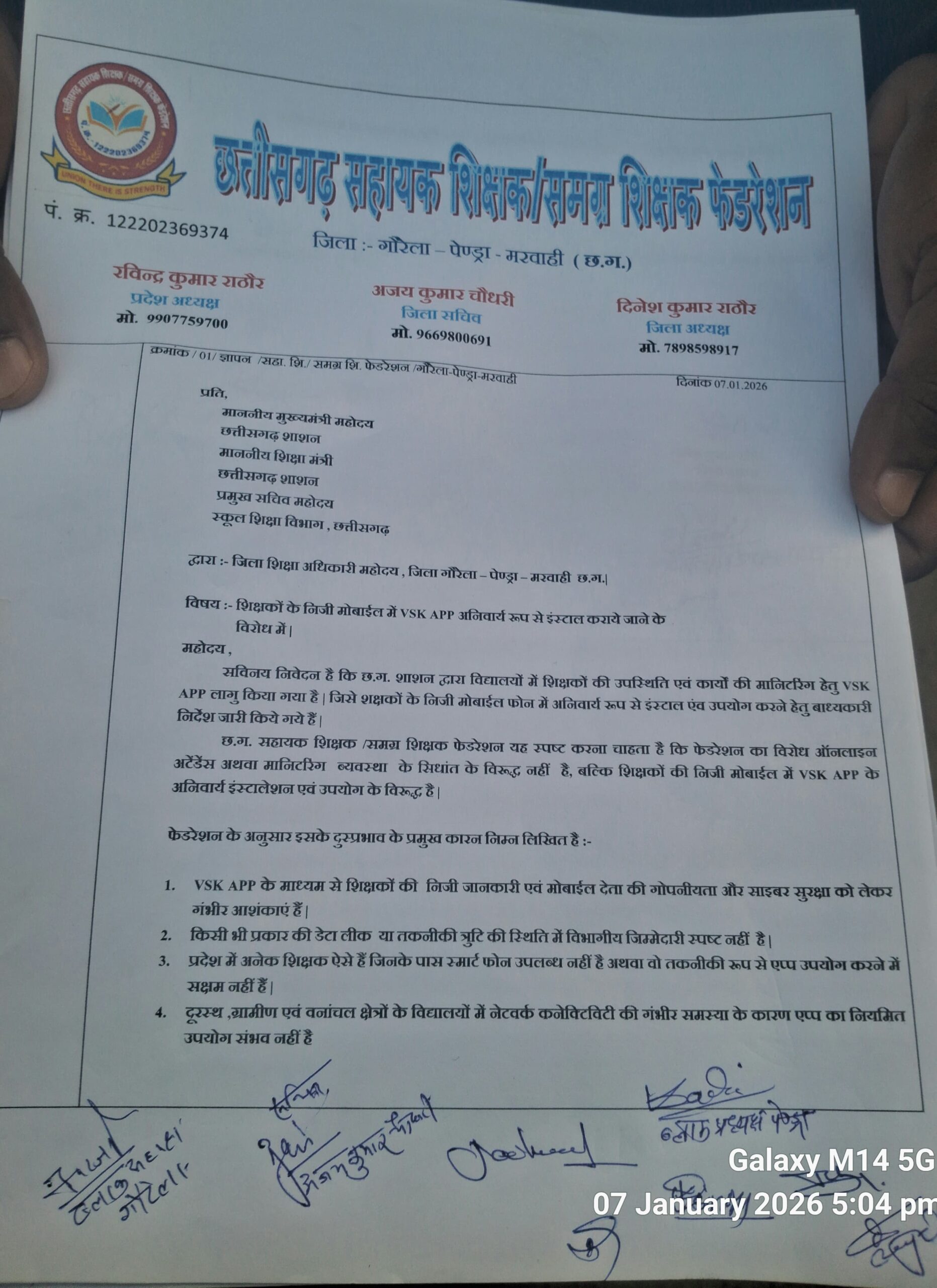 गौरेला: सहायक शिक्षक / समग्र शिक्षक फेडरेशन जिला GPM ने संगठन के प्रांतीय आह्वान पर प्रदेश में शिक्षकों की ऑनलाइन उपस्थिति हेतु संचालित VSK (विद्या समीक्षा केंद्र) app के विरोध हेतु माननीय मुख्यमंत्री, शिक्षा मंत्री, प्रमुख सचिव महोदय के नाम ज्ञापन जिला शिक्षा अधिकारी को सौंपा। जिलाध्यक्ष दिनेश कुमार राठौर ने बताया कि जब से जिले के शिक्षकों ने VSK app में रजिस्ट्रेशन किया है तब से लगभग 100 शिक्षकों को साइबर ठगों के फोन, वीडियो काॅल आदि आ रहे हैं और शिक्षकों को डिजिटल अरेस्ट करके पैसों की माँग कर रहे हैं और ठगों के पास शिक्षकों की व्यक्तिगत जानकारी भी है जिससे उनकी चपेट में कुछ शिक्षक आकर ठगी का शिकार हो चुके हैं और अन्यों को भी ऑनलाइन ठगी होने का डर बना रहता है। शिक्षकों के मोबाइल में UPI एवं बैंकिंग app होने से भी निरंतर भय बना रहता है। अतः संगठन की सरकार से माँग है कि VSK app को तत्काल बंद किया जाय और यदि ऑनलाइन उपस्थिति लेनी है तो अन्य डिवाइस प्रदान की जाय अथवा पूर्व में दिए गए टेबलेट की मरम्मत करा दी जाय। जिससे कि शिक्षकों की निजता की रक्षा हो सके।