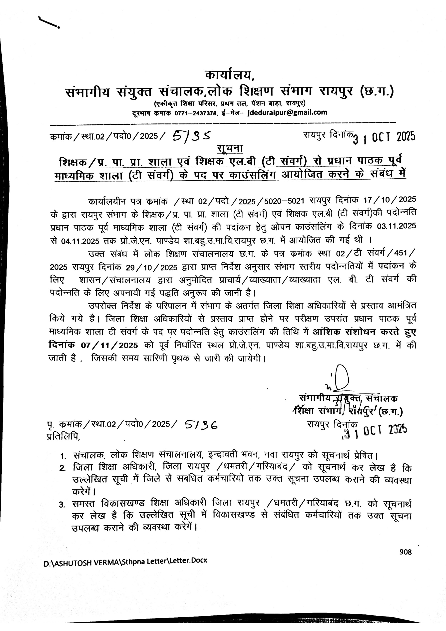 रायपुर। संभागीय संयुक्त संचालक शिक्षा संभाग रायपुर ने संभाग में 3नवंबर को आयोजित मिडिल एचएम टी संवर्ग पदोन्नति उपरांत पदस्थापना काउंसिलिंग की तिथि में बदलाव करते हूये आगामी 7 नवंबर को आयोजित किया हैं इस बाबत सभी जिला शिक्षाअधिकारियों को पत्र जारी कर सूचना दे दी गई हैं।