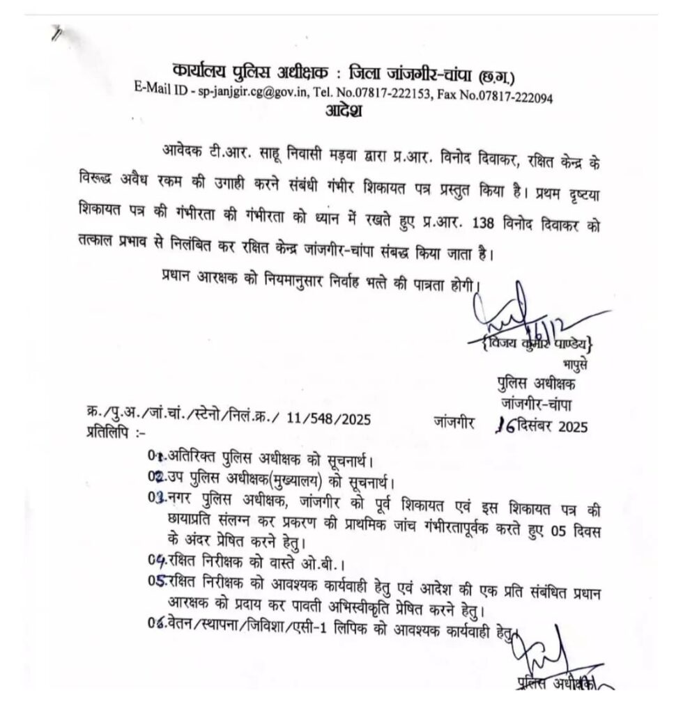 जांजगीर-चांपा। जिला पुलिस अधीक्षक कार्यालय से जारी आदेश ने पुलिस विभाग की अंदरूनी कार्यप्रणाली पर करारा प्रहार किया है। रक्षित केंद्र जांजगीर-चांपा में पदस्थ प्रधान आरक्षक क्रमांक 138 विनोद दिवाकर पर अवैध राशि की उगाही जैसे गंभीर आरोप सामने आने के बाद उन्हें तत्काल प्रभाव से निलंबित कर दिया गया है। यह कार्रवाई आवेदक टी.आर. साहू द्वारा प्रस्तुत गंभीर शिकायत पत्र के आधार पर की गई है।