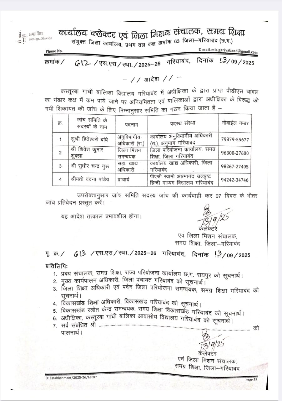 गरियाबंद। गत दिनों कस्तूरबा गांधी बालिका छात्रावास के चावल के हेराफेरी की शिकायत मीडिया के माध्यम से बाहर आने व चावल निर्धारित मात्रा से कम पाए जाने की मामले कों गरियाबंद कलेक्टर ने गंभीरता से लेते हूये एसडीएम गरियाबंद सुश्री हितेश्वरी बांधे के नेतृत्व में चार सदस्यीय जाँच दल का गठन कर सात दिनों में रिपोर्ट देने को कहा हैं।