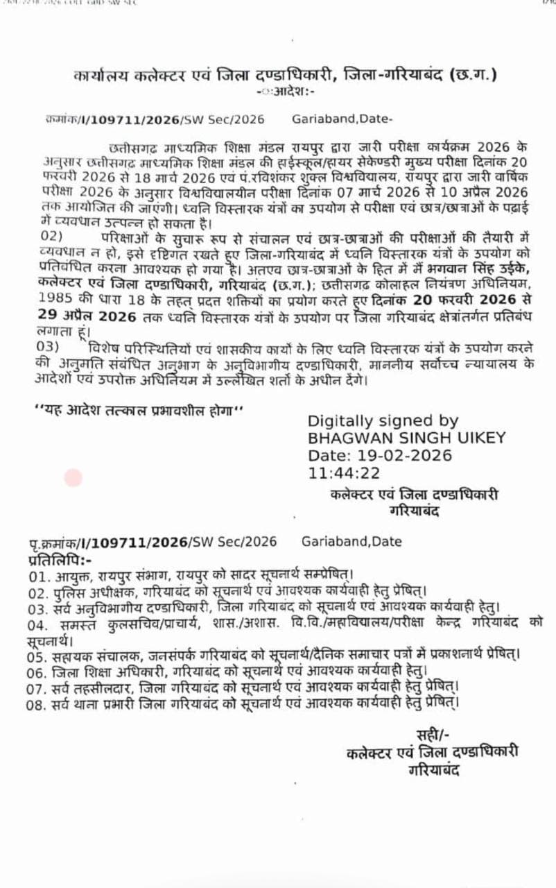 02) परिक्षाओं के सुचारू रूप से संचालन एवं छात्र-छात्राओं की परीक्षाओं की तैयारी में व्यवधान न हो, इसे दृष्टिगत रखते हुए जिला-गरियाबंद में ध्व ध्वनि विस्तारक यंत्रों के उपयोग को प्रतिबंधित करना आवश्यक हो गया है। अतएव छात्र-छात्राओं के हित में मैं भगवान सिंह उईके, कलेक्टर एवं जिला दण्डाधिकारी, गरियाबंद (छ.ग.); छत्तीसगढ़ कोलाहल नियंत्रण अधिनियम, 1985 की धारा 18 के तहत् प्रदत्त शक्तियों का प्रयोग करते हुए दिनांक 20 फरवरी 2026 से 29 अप्रैल 2026 तक ध्वनि विस्तारक यंत्रों के उपयोग पर जिला गरियाबंद क्षेत्रांतर्गत प्रतिबंध लगाता हूं।