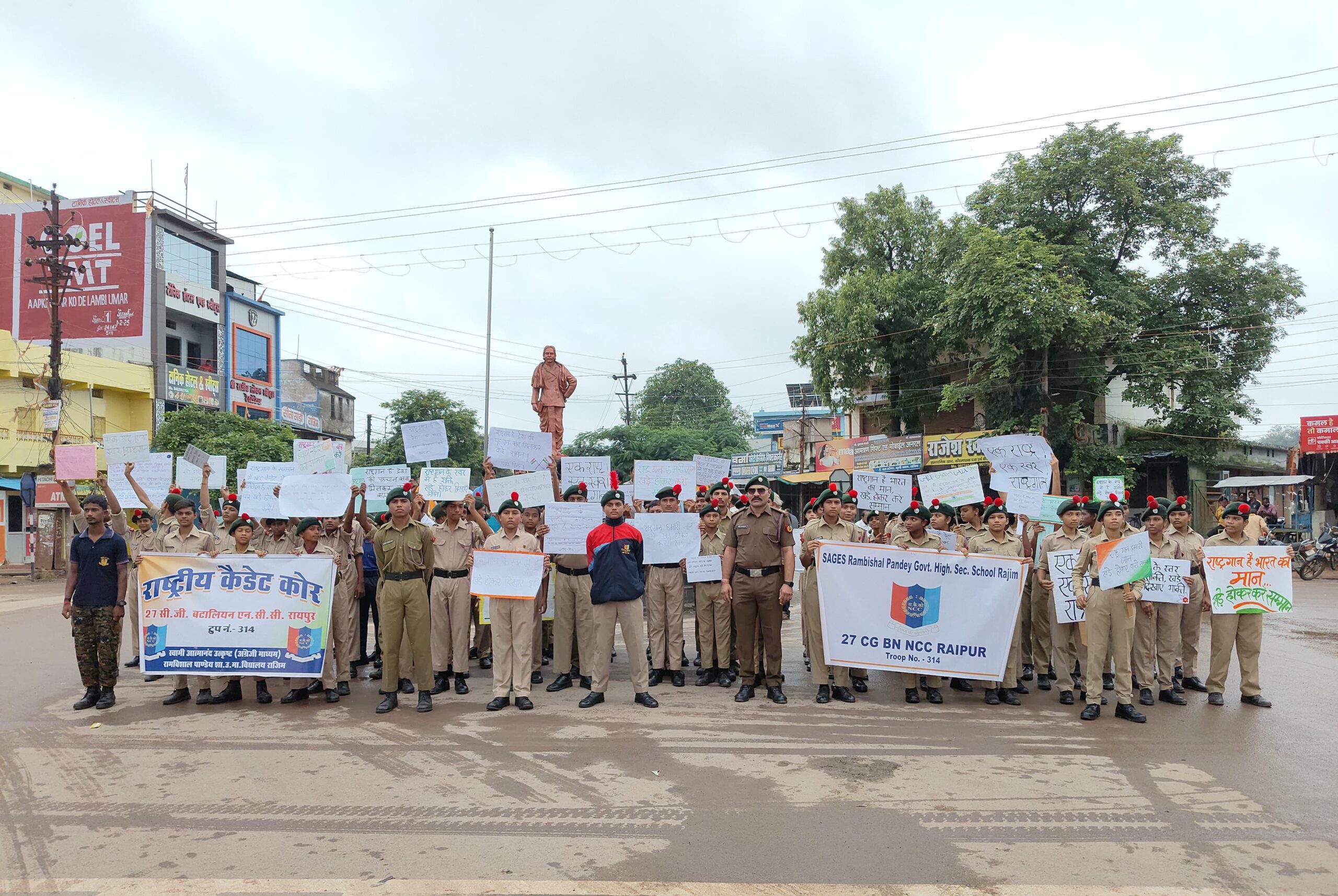 राजिम। नगर के प्रतिष्ठित पंडित रामबिशाल पाण्डेय सेजेस राजिम के छात्र सैनिकों ने राष्ट्रगान के सम्मान में चलाया जागरूकता अभियान जिसके अंतर्गत 27 छत्तीसगढ़ बटालियन एनसीसी रायपुर के कमान अधिकारी कर्नल सौरभ कुमार एवं प्रशासनिक अधिकारी कर्नल प्रदीप नायर के निर्देशन एवं मार्गदर्शन में तथा नगर पंचायत राजिम के अध्यक्ष महेश यादव एवं पार्षदगण तथा अन्य गणमान्य नागरिकों के सहयोग से सेजेस राजिम के एनसीसी अधिकारी सागर शर्मा के नेतृत्व में पंडित सुन्दर लाल शर्मा चौक बस स्टैंड राजिम पर प्रातः 8 बजे राष्ट्रगान के सम्मान में जागरूकता अभियान चलाया गया जिसमें एनसीसी छात्र सैनिकों ने बढ़चढकर हिस्सा लिया विदित हो कि नगर पंचायत राजिम क्षेत्र में प्रतिदिन प्रातः 8 बजे राष्ट्रगान स्पीकर के माध्यम से बजाया जाता है इस अभिनव पहल की शुरूआत 15 अगस्त,स्वतंत्रता दिवस से की गई है इसी तारतम्य में नगर के एनसीसी कैडेट्स ने नगरवासियों एवं प्रतिदिन आने जाने वाले राहगीरों, दुकानदारों, व्यापारियों,वाहन मालिकों एवं आसपास रहने वाले लोगो के लिए जागरूकता अभियान चलाते हुए राष्ट्रगान के सम्मान में बैनर, पोस्टर लेकर नारे लगाते हुए रैली के रूप में बस स्टैंड चौंक में एकत्रित हुए तथा चारों दिशाओं से आने वाले मार्ग को राष्ट्रगान बजते तक मानव श्रृंखला बनाकर रोका गया तथा पोस्टर के माध्यम से सावधान की मुद्रा में खड़े होकर राष्ट्रगान को सम्मान दिया तत्पश्चात सभी ने एक स्वर में भारत माता की जय एवं जय हिन्द के नारे लगाकर संदेश दिया साथ ही संकल्प लिया कि प्रतिदिन राष्ट्रगान बजाए जाने पर हम सभी पूरे सम्मान के साथ खड़े होकर भारतीय नागरिक होने का कर्तव्य निभाएंगे। उपरोक्त जागरूकता अभियान कार्यक्रम में प्रमुख रूप से नगर पंचायत राजिम के अध्यक्ष महेश यादव,पार्षद गण भारत यादव,बलराम यादव,सुरेश पटेल, अजय पटेल ,उत्तम निषाद, नरोत्तम ठाकुर,बेरोजगार संघ अध्यक्ष देवेन्द्र शर्मा,गजाधर ठाकुर लाला साहू,पवन सोनी,भावेश ठाकुर, लिलेश्वर यादव,धर्मेंद्र शर्मा,धीरेन्द्र शर्मा,सुनील देवांगन,अरविंद शर्मा,विकाह तिवारी,मोंटू दुबे एवं अन्य गणमान्य नागरिक शामिल रहे।