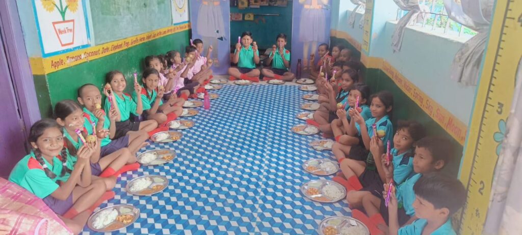 प्रधानमंत्री पोषण आहार योजना के अंतर्गत खिचरी स्कूल की प्रधान पाठिका ने अपने पुत्र के जन्मदिन के अवसर पर स्कूल के बच्चों को पोषण आहार न्योता भोज कराया हैं