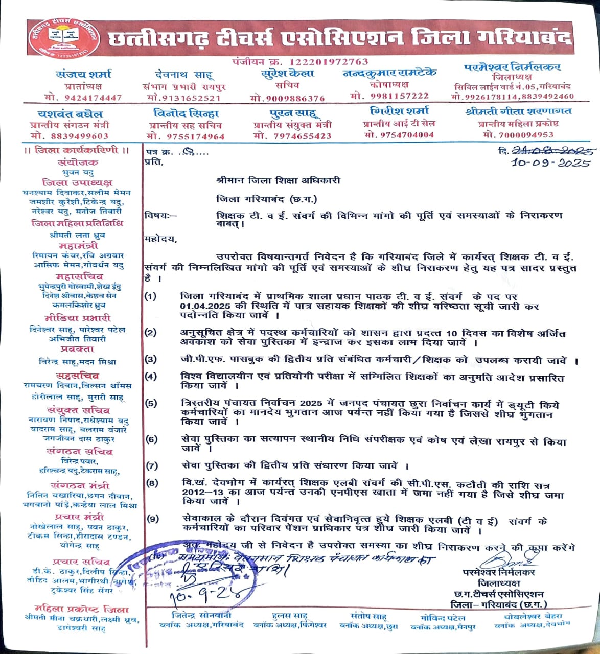 गरियाबंद। गरियाबंद जिले में प्राथमिक प्रधानपाठक के शेष रिक्त पदों पर शीघ्र पदोन्नति की जाएगी जिसके लिये 1-04-24 की स्थिति में वरिष्ठता सूची प्रकाशन शीघ्र होगी उक्त का आश्वासन गरियाबंद जिले के जिला शिक्षा अधिकारी जगजीत सिंह धीर ने टीचर्स एसोसियेशन के प्रतिनिधि मंडल कों दिया जिला शिक्षा अधिकारी के समक्ष अपनी 10सूत्रीय माँग रखी जिसे जिला शिक्षा अधिकारी ने गंभीरता पूर्वक सुना और बिंदु वार निराकरण करने का आश्वाशन दिये मांगों में प्रमुख रूप से प्राथमिक प्रधान पाठक पद पर शेष पदोन्नति ,पुनरीक्षित वेतन मान एरियर,सर्विस बुक सत्यापन,सीपीएस कटौती, सहित दस मांगे शामिल रही।