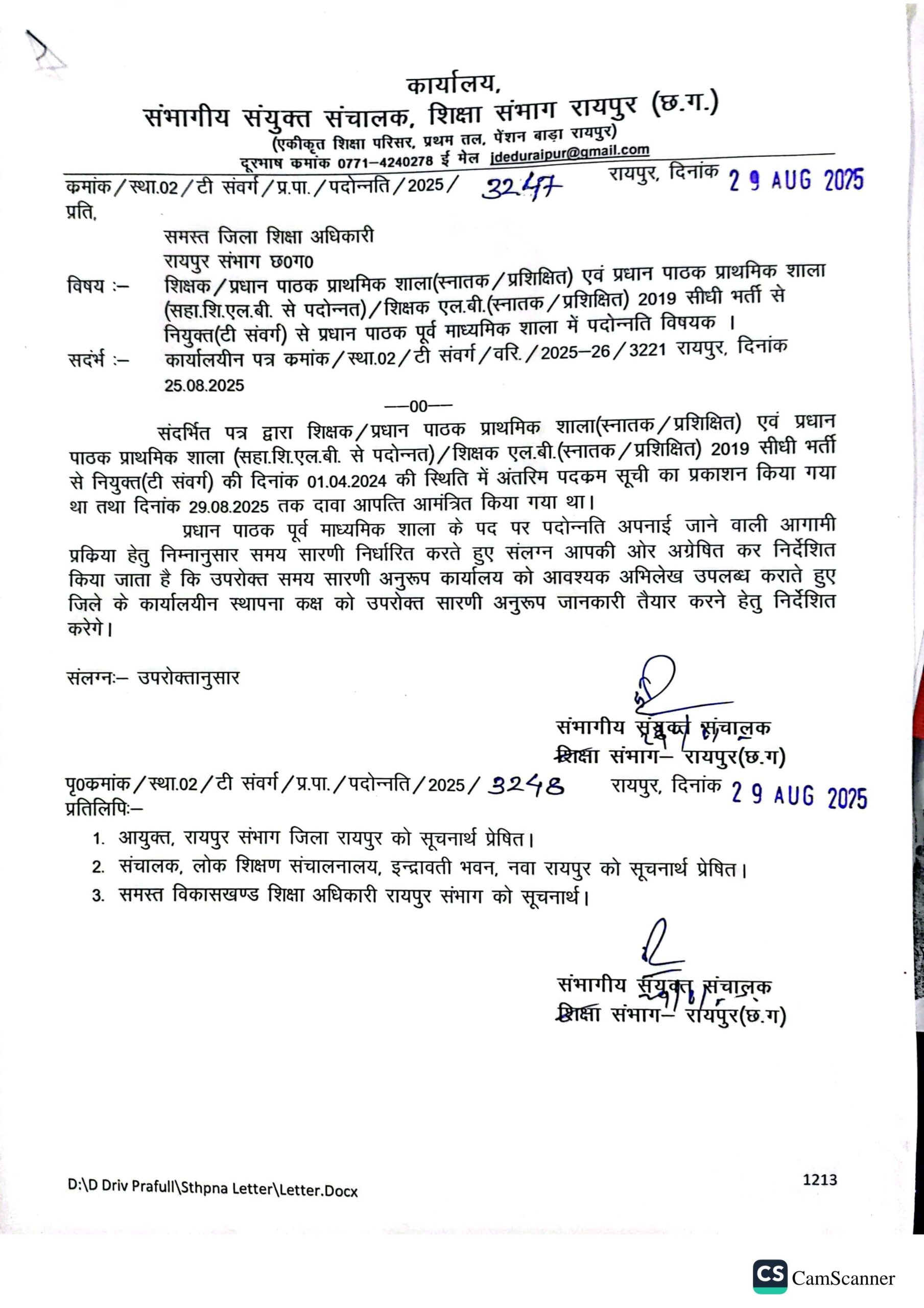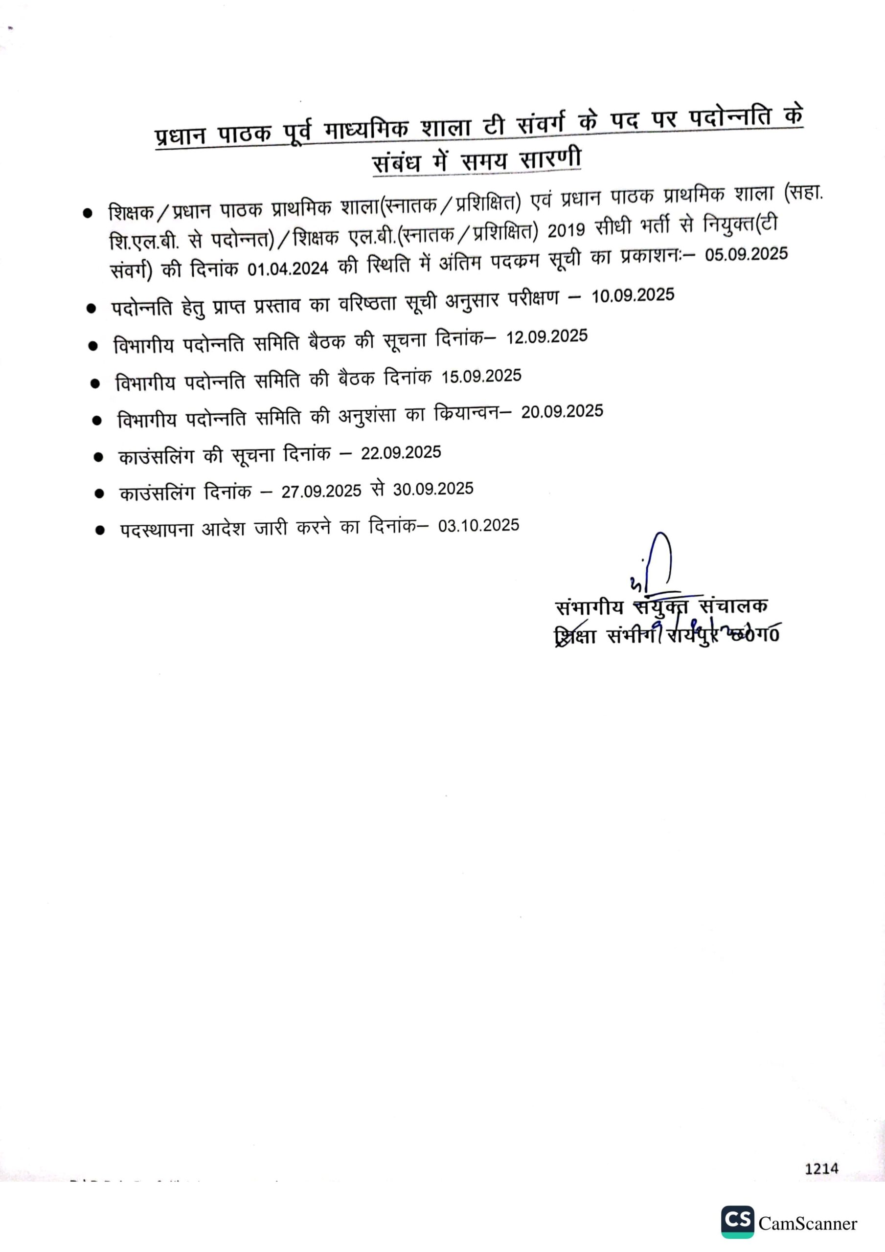 रायपुर।संभागीय संयुक्त संचालक शिक्षा रायपुर नें रायपुर संभाग मे मिडिल स्कूल प्रधान पाठकों क़ो पदोन्नति देने की प्रक्रिया प्रारंभ कर दावा आपत्ति से पदस्थापना आदेश तक समय सारिणी का प्रकाशन कर 1-04-2024 की स्थिति मे अंतिम वरिष्ठता सूची जारी कर दावा आपति पश्चात अंतिम वरिष्ठता सूची प्रकाशित कर पदोन्नति प्रक्रिया शुरू की जाएगी।