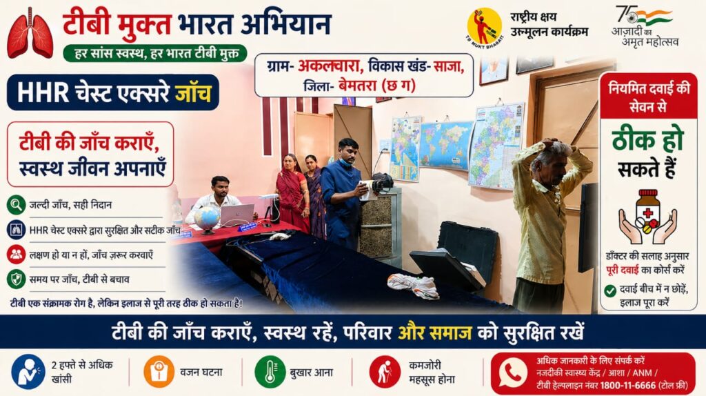 बेमेतरा/साजा: स्वास्थ्य विभाग जिला बेमेतरा में क्षय रोग उन्मूलन कार्यक्रम तहत टीबी मुक्त बेमेतरा जिला बनाने के लिए विशेष अभियान चलाया जा रहा है जिसके तहत अत्याधुनिक एक्स-रे मशीन से उच्चोखिम लोगों का सभी विकासखण्ड में विभिन्न स्थानों पर शिविर आयोजित कर टी बी स्क्रीनिंग किया जा रहा है साथ में टी बी मुक्त भारत अभियान की जानकारी, टी बी के लक्षण,उपचार,बचाव की संपूर्ण जानकारी उच्चोखिम लोगों को साझा किया जा रहा है। इसी क्रम में